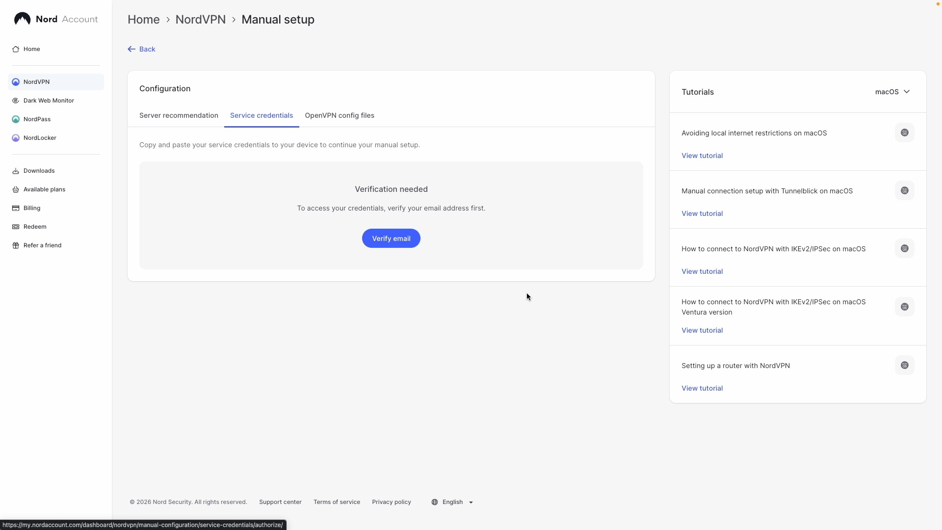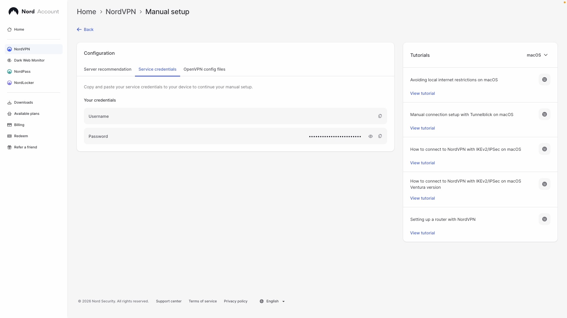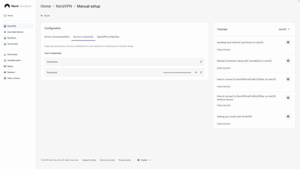 On the Manual Setup page of the NordVPN site, Click Service credentials.