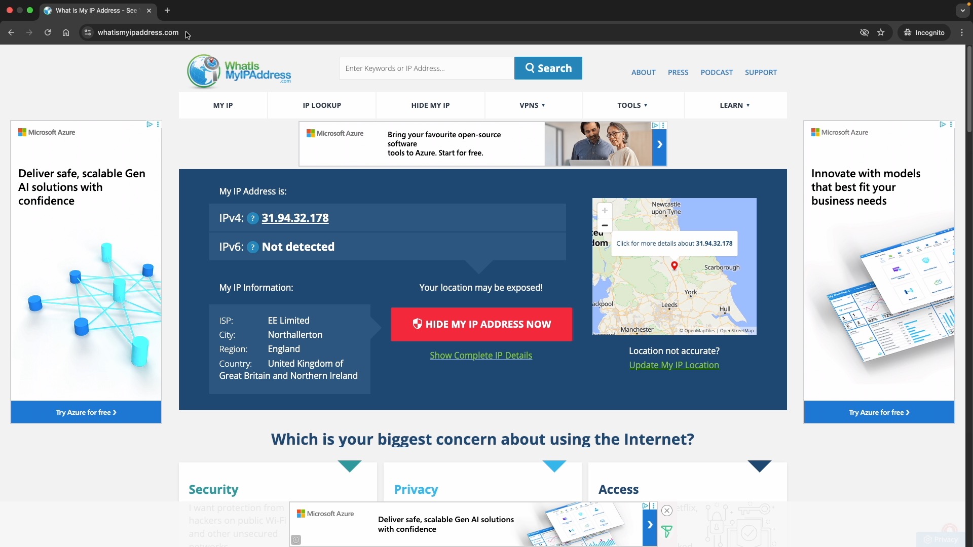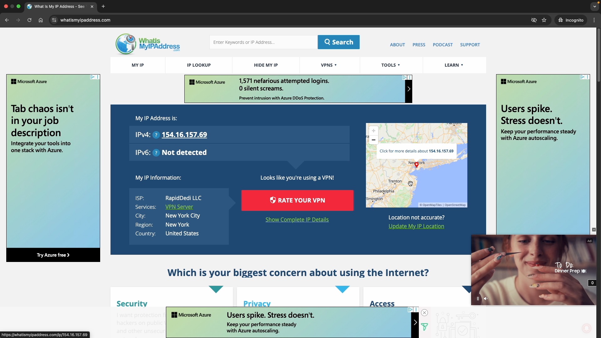 So, lets get back to our web browser and go back to https://whatismyipaddress.com We can see the website shows us a different IP address, and our location is now set in New York, in the United States.